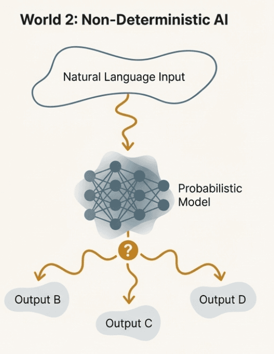 Second, the output is no longer guaranteed. The same input, or even small changes in phrasing, can yield different responses across runs. This is a property of the models powering these products. They are highly sensitive to context and phrasing, and they produce probabilistic outputs rather than fixed answers.